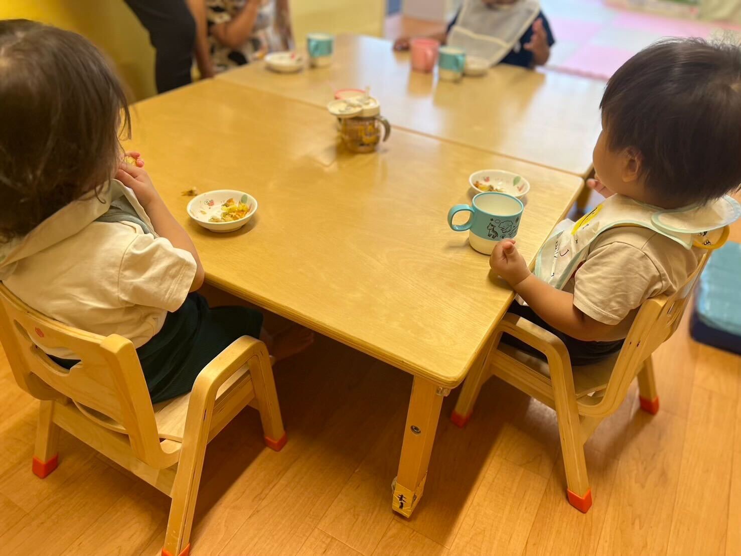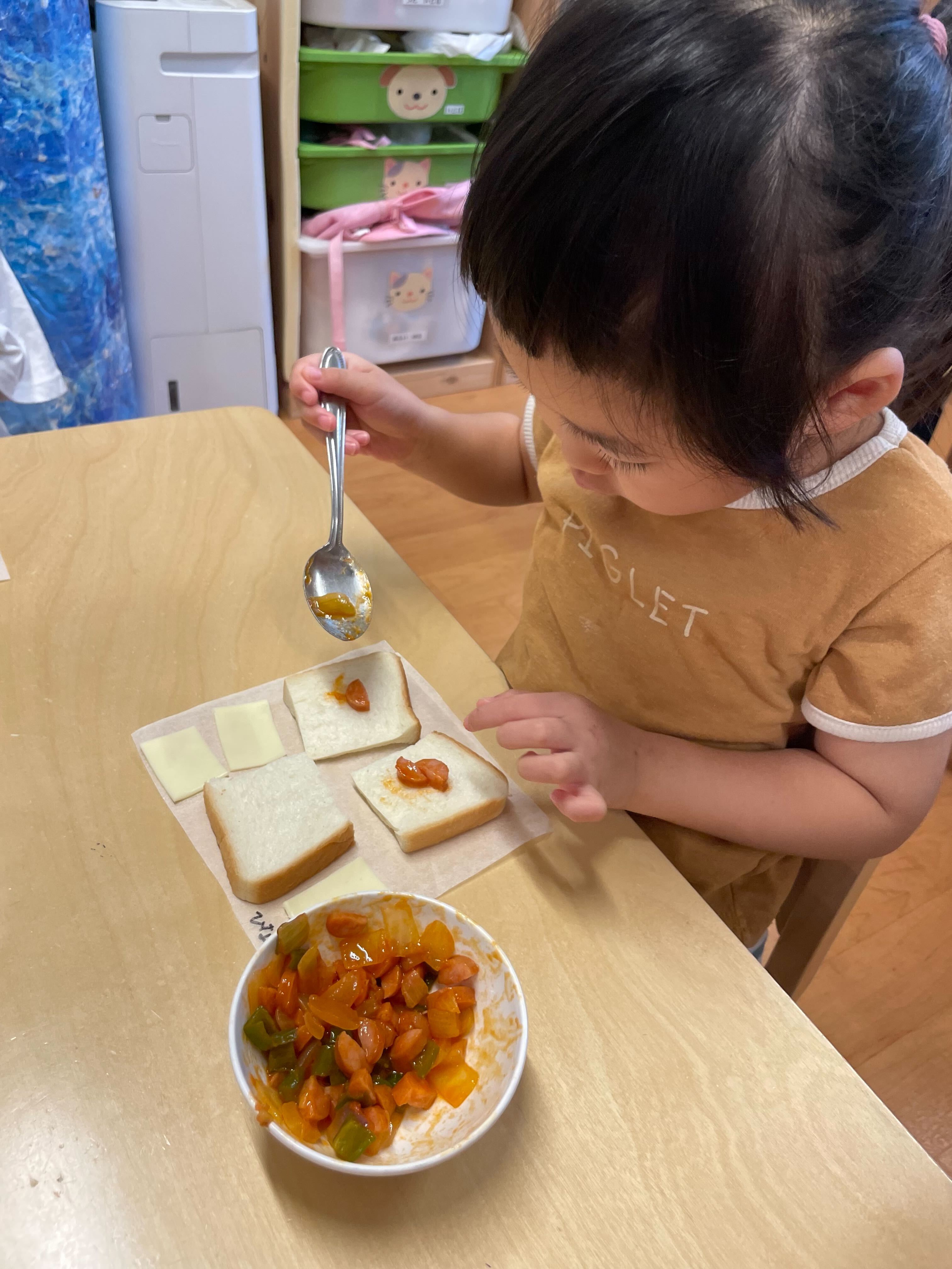 クッキング保育も簡単なものですが行っています。最近では、食パンの上にケチャップ、ピーマン、チーズを乗せて、自分たちでピザトーストを作っておやつで提供をしました。2歳〜5歳ではおにぎり作りを行いました。普段食が細い子も自分で作ったものはよく食べてくれました。今後は、3色食品群についての遊びや食Laboにある「お誕生日のランチョンマット」も使ってみたいと思います。普段の食事の中にも、食事に興味を持ってもらえるような工夫ができたらと思っています。調理1人でもこんなに食育を行えたり、次にやりたいことを考える余裕もあるのは嬉しく思います。.jpg)