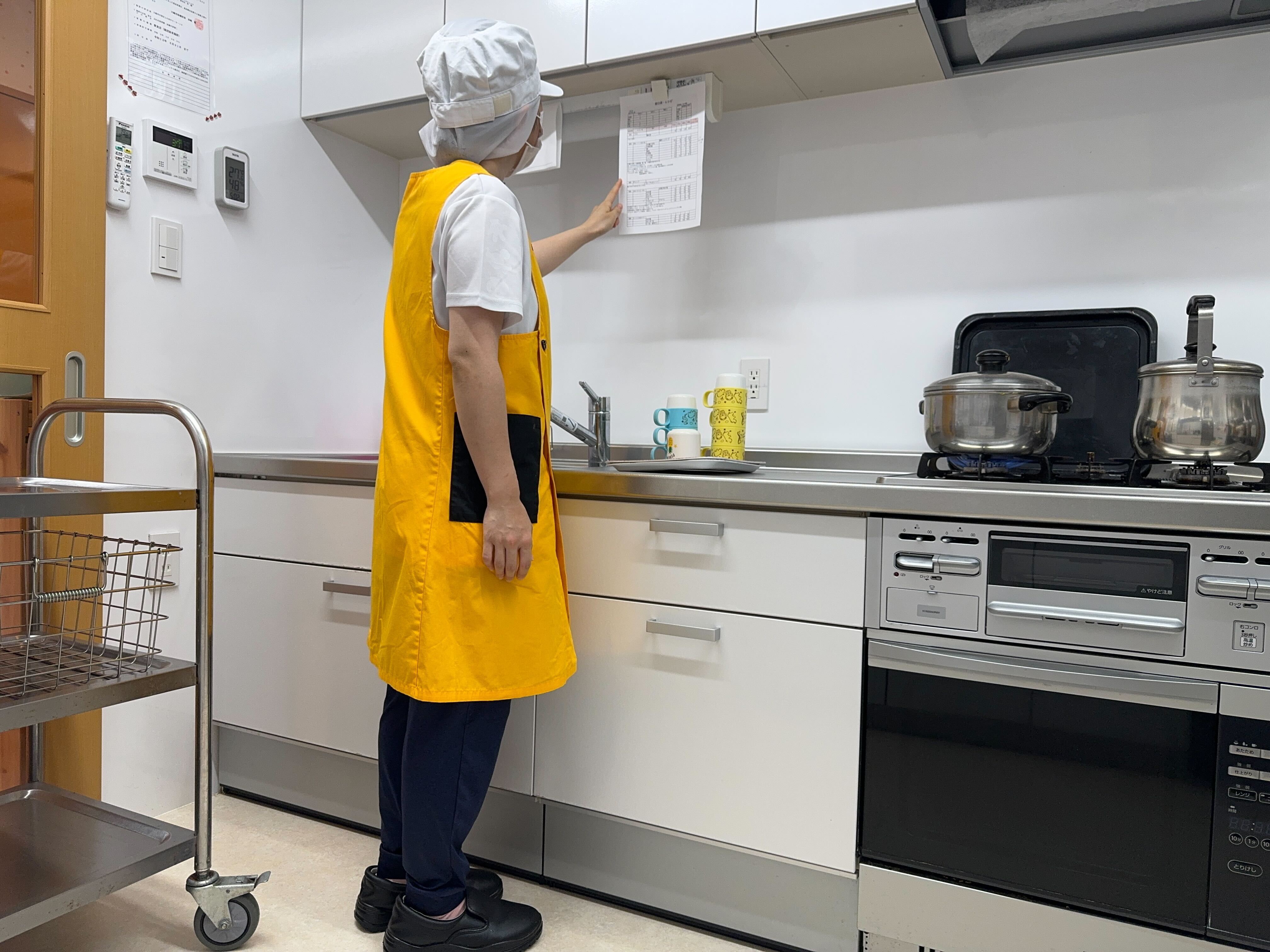 調理をする際は、献立Laboからダウンロードした調理用レシピを見てレシピ通りに作っています。内容がしっかり書いてあるので、とても助かっています。その日のメニュー内容を確認して、提供時間に間に合うように、調理の開始時間を調整しています。