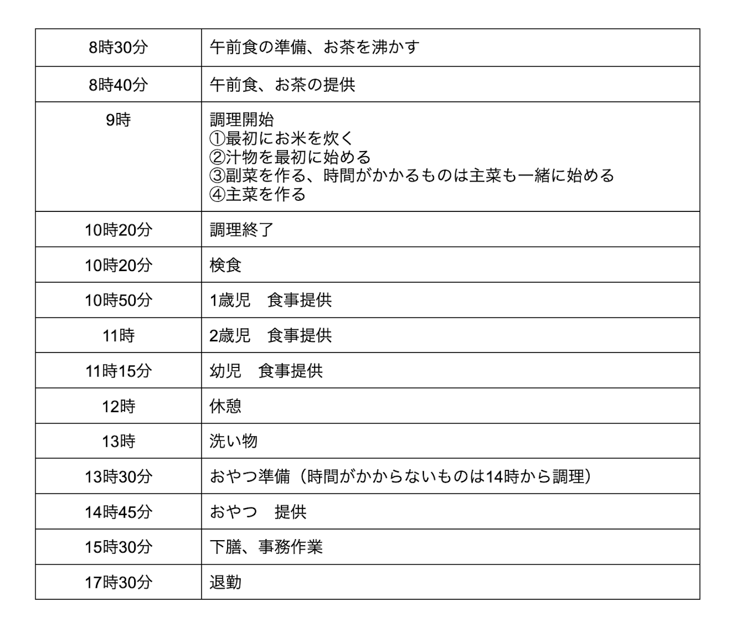 園児21名分、職員3〜8名分を1人で調理しています。毎日8時30分〜17時30分まで勤務し、提供時間に十分間に合っています。