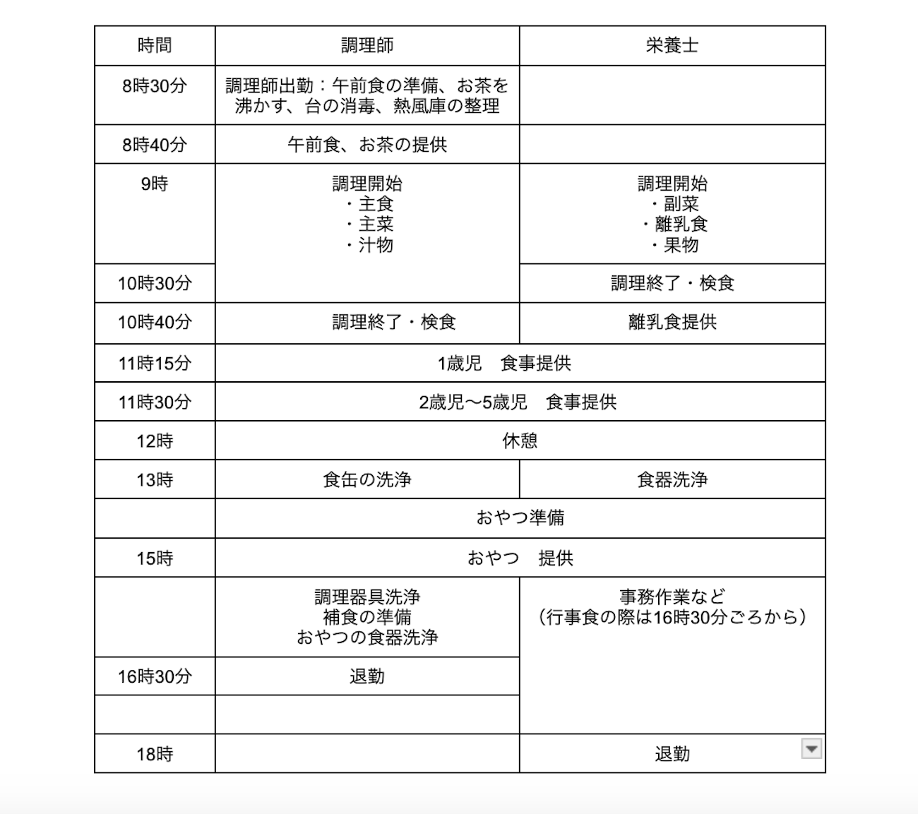 シフトは、調理師が8時30分から16時30分、栄養士が9時から18時で出勤時間をずらして出勤しています。