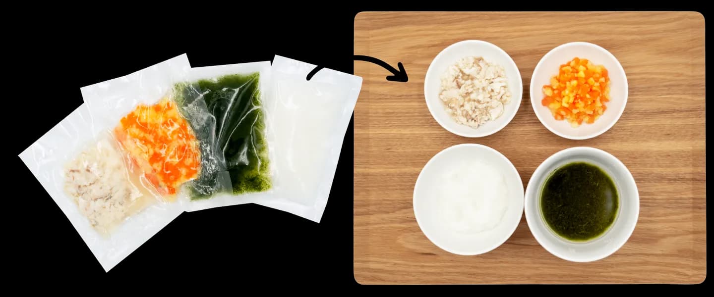 廃棄いらず幼児食3名分の小分けパック。冷凍で1ヶ月以上日持ちするので、必要な時に必要な分だけご使用いただけます。