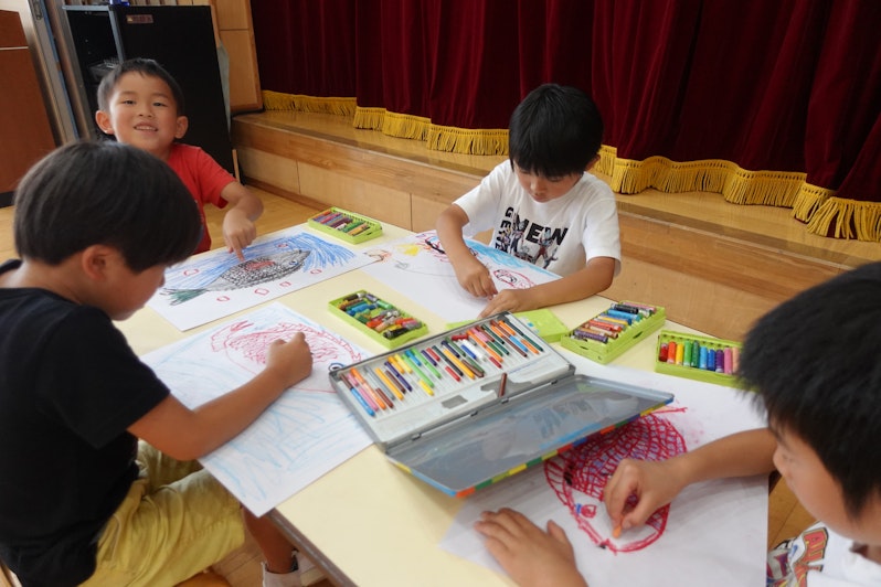 ・鯛の骨の太さにもびっくりしながら、「美味しい」といって勢いよく食べていました。食後に20分ぐらいで即興の絵を描いてみると、写生したような風合いで鯛を描いたり(橋本さんを描く子も)、その後、図鑑などを引っ張り出してきて調べ学習していました。(5歳児クラス)