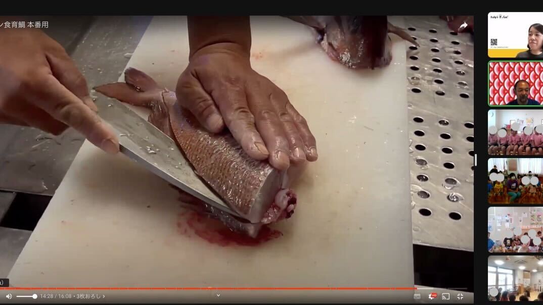 オンライン当日は、橋本さんから船にのり海上のいけすまで案内していただき、赤ちゃんのいけす、1年目のいけす、2年目のいけすと3つに分けて育てている様子やスーパーに生きたまま専用のかごに入れ出荷している様子、鯛をスーパーで売られている形にどうしたらなるのかまるごと一匹捌いていただきました。捌いている途中、血が出たり、心臓が動いている場面で「鯛は生きているんだよ」という橋本さんの言葉にみんな真剣な表情で捌かれていく鯛をみていました。