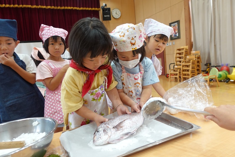 ・ほとんどの子どもが、スーパーで売られている魚の切り身しか見たことがなかったが切り身の状態ではない魚に人間と同じように歯、心臓などがあることがわかり、また養殖という仕事があることを学ぶことが出来た。家庭ではなかなかやらない鯛の塩釜焼も好評だった。終了後、楽しかったなどいろいろな意見があった。今回、参加することができとても良かったと思う。(5歳児クラス)