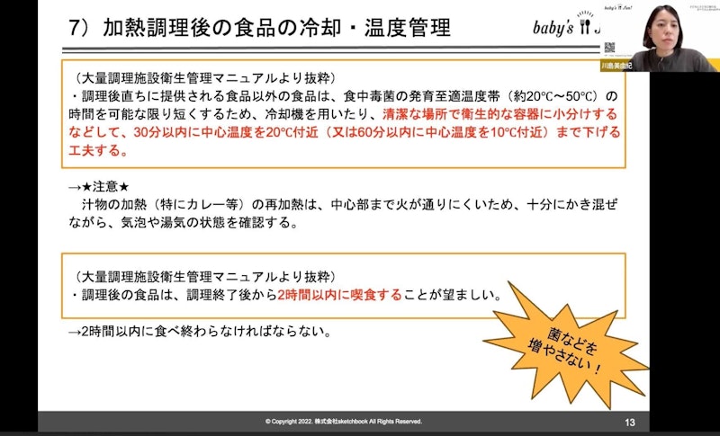 調理をして1〜3年目の栄養士さんや調理さん向けにbaby’s fun!の管理栄養士から、食中毒を発症しないための衛生管理の基本のきのお話をさせていただきました。一部をご報告します。